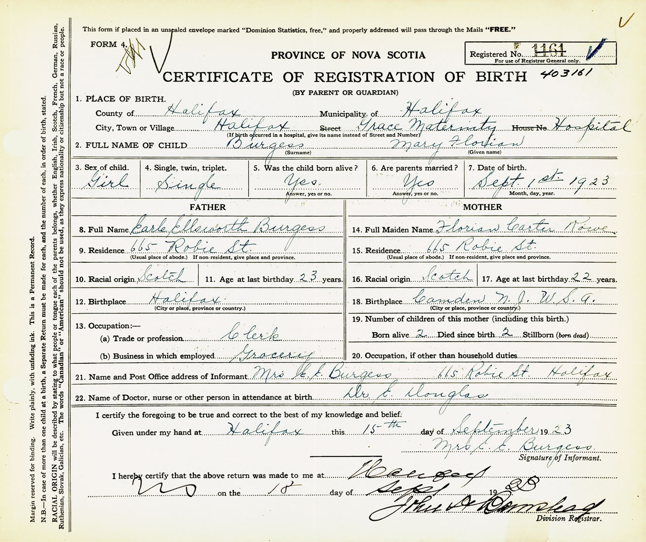 Female Birth Registration: Year: 1923 number: 40300161