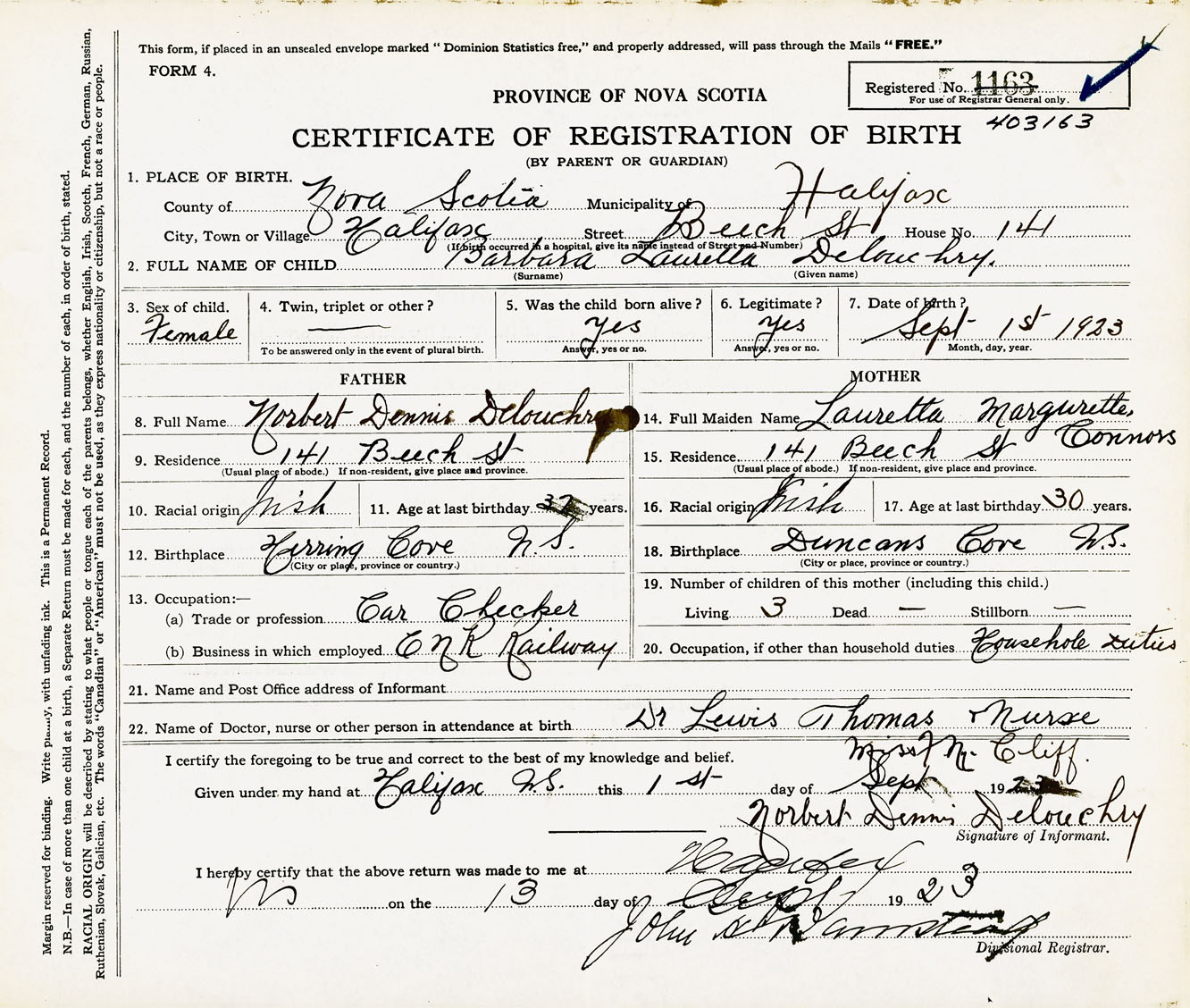 Female Birth Registration: Year: 1923 number: 40300163
