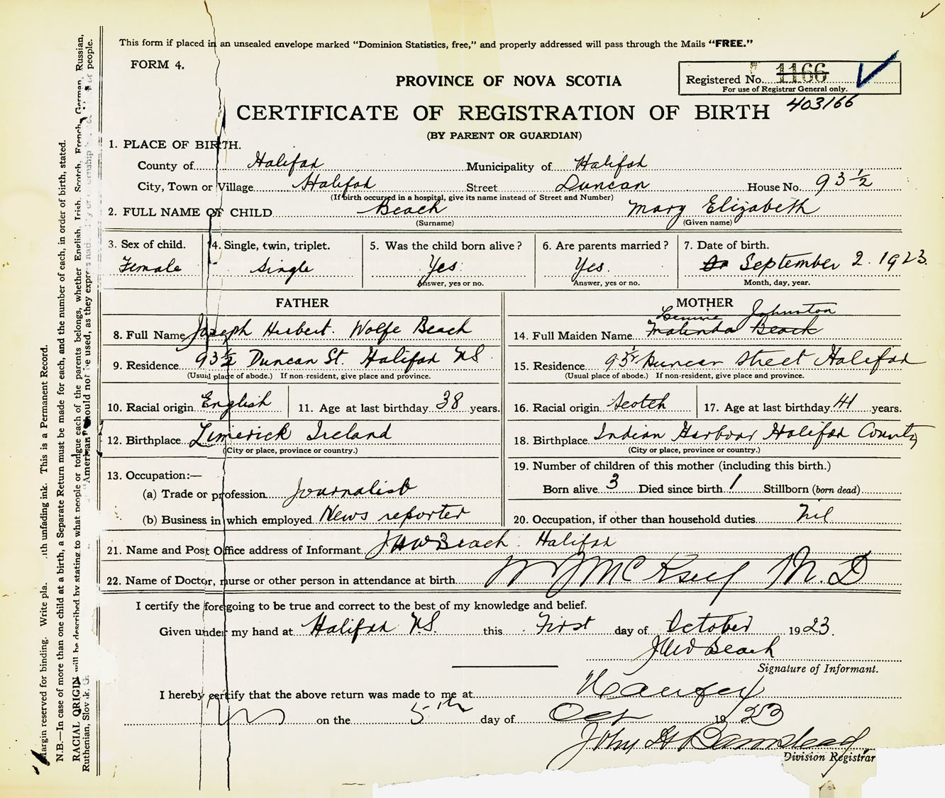 Female Birth Registration: Year: 1923 number: 40300166