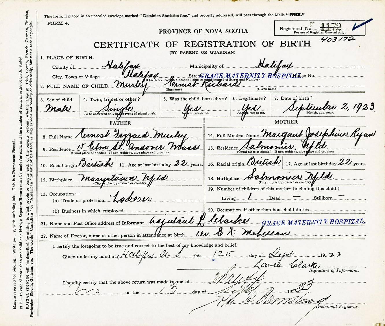 Male Birth Registration: Year: 1923 number: 40300172