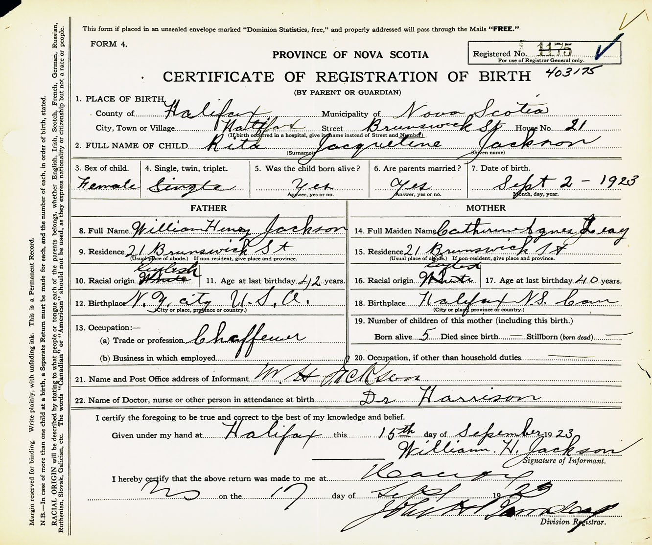 Female Birth Registration: Year: 1923 number: 40300175