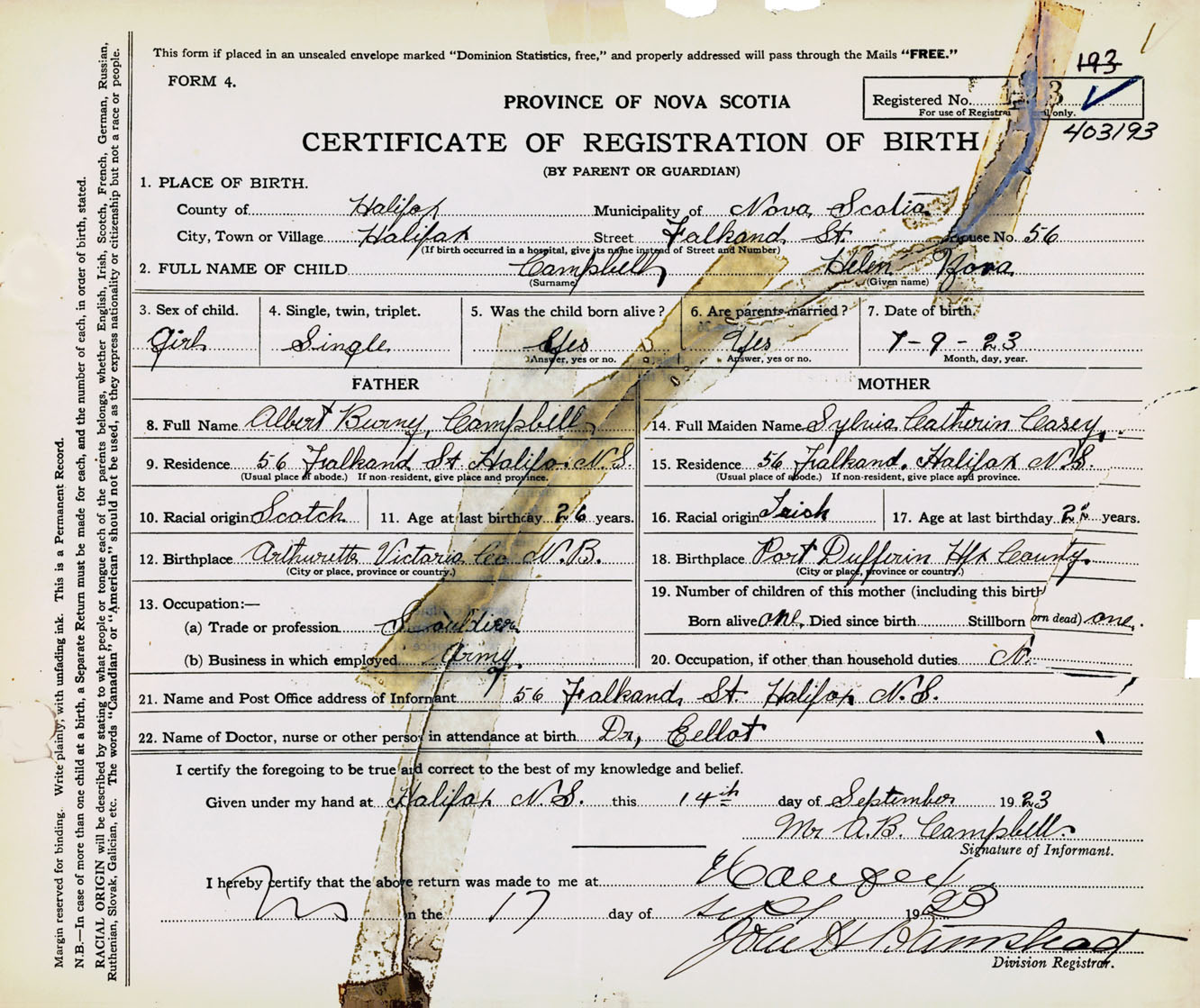 Female Birth Registration: Year: 1923 number: 40300193