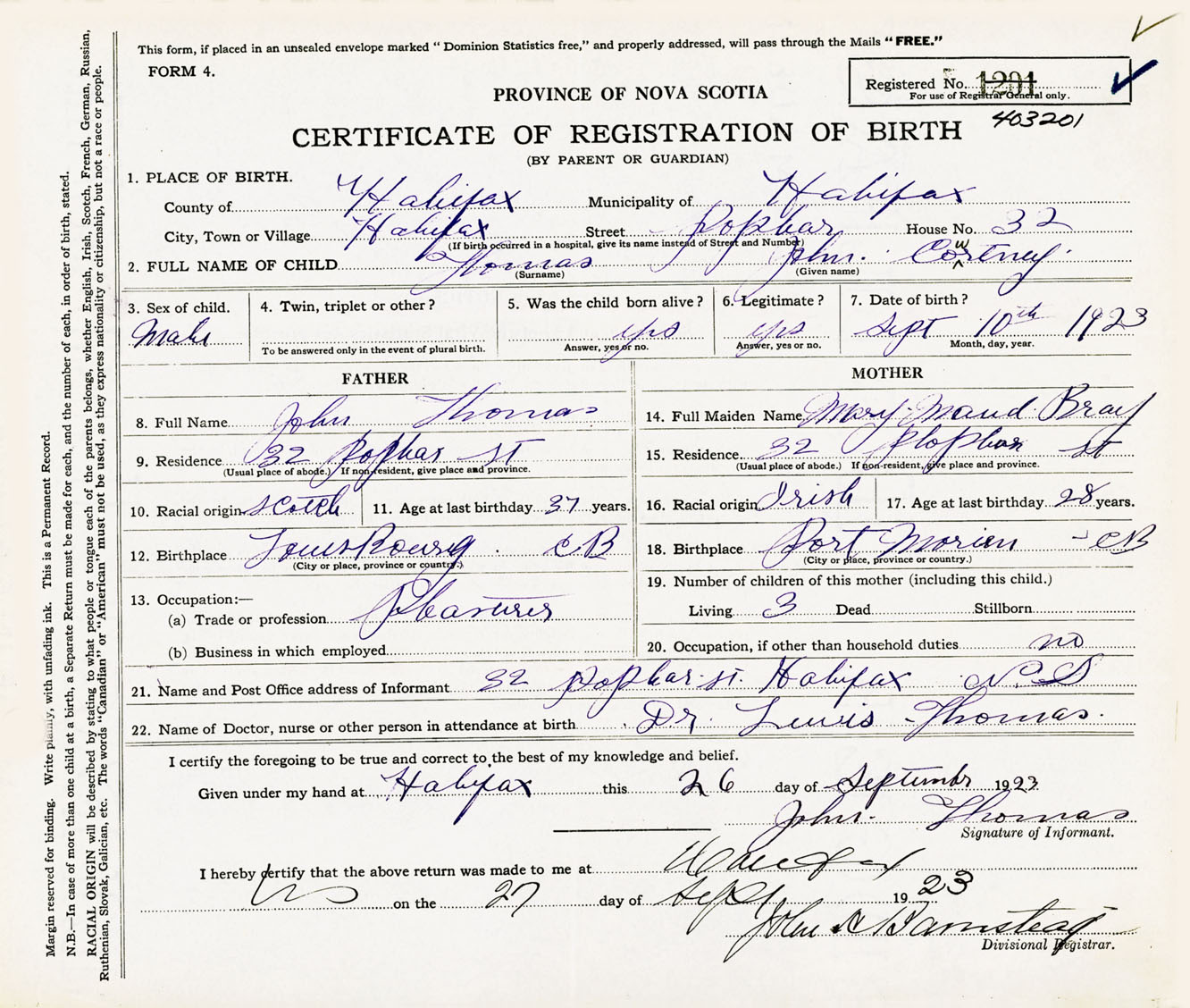 Male Birth Registration: Year: 1923 number: 40300201