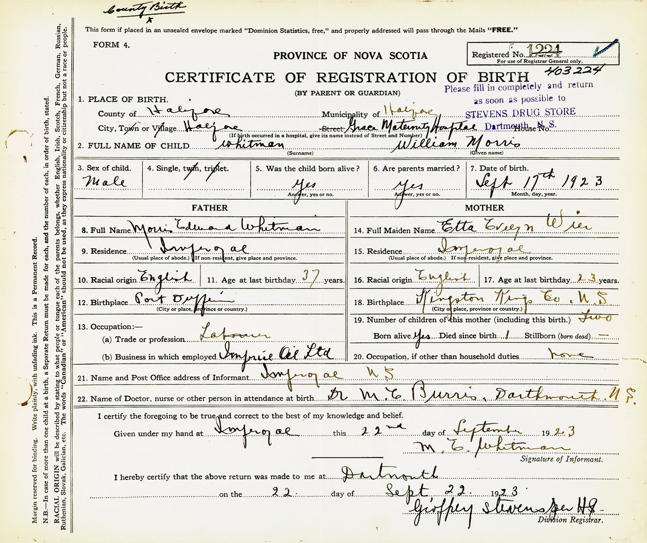 Male Birth Registration: Year: 1923 number: 40300224