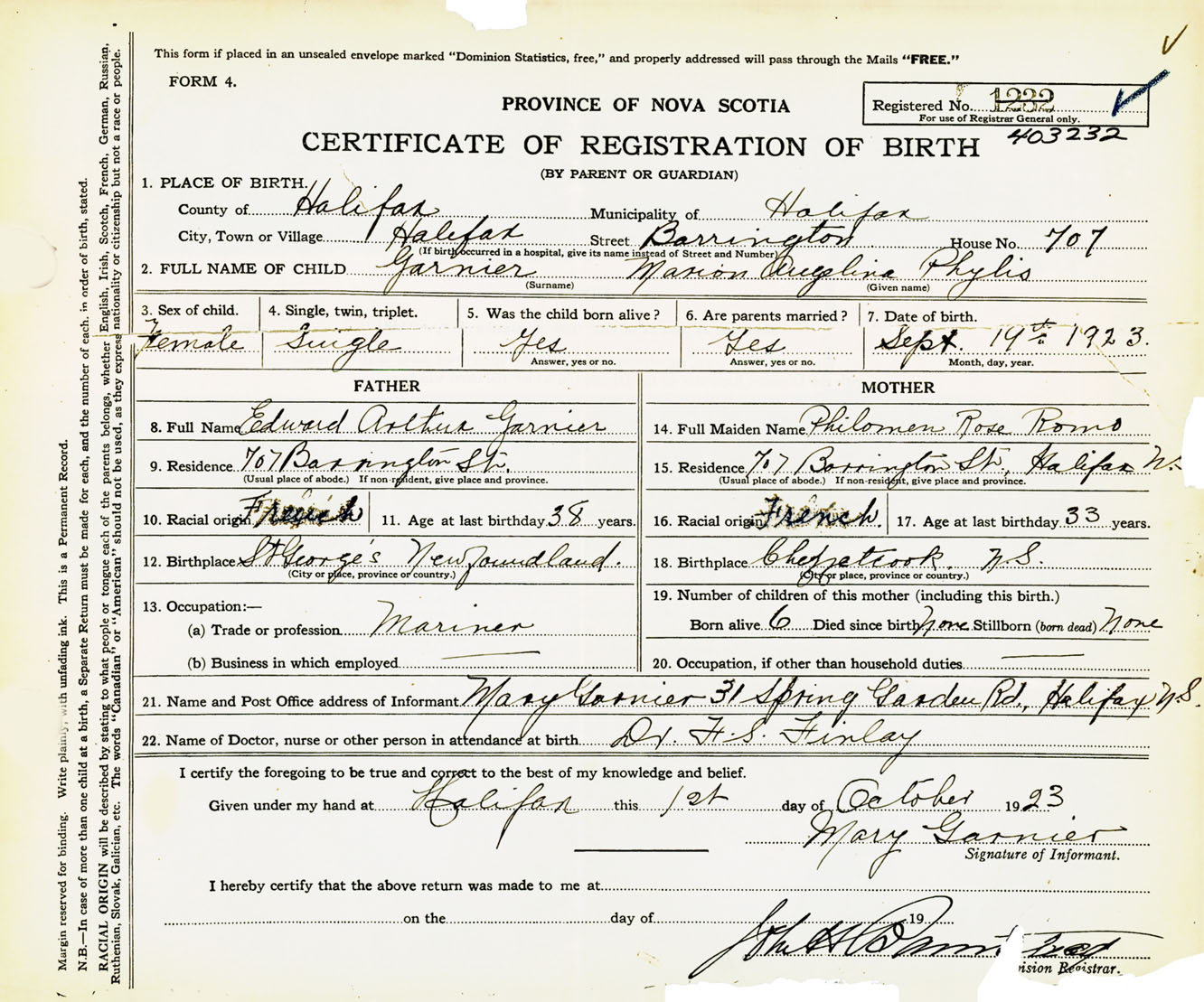Female Birth Registration: Year: 1923 number: 40300232