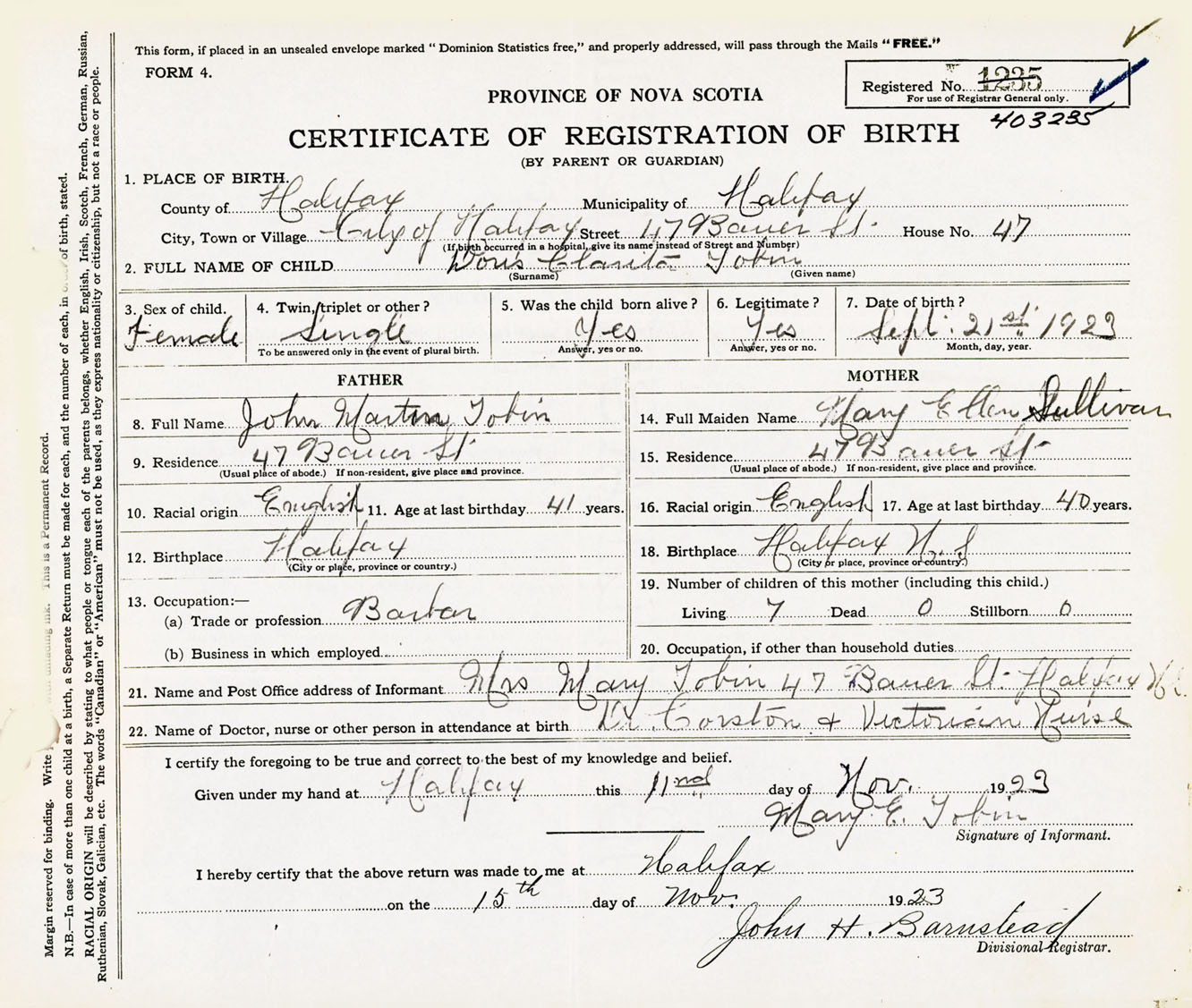 Female Birth Registration: Year: 1923 number: 40300235