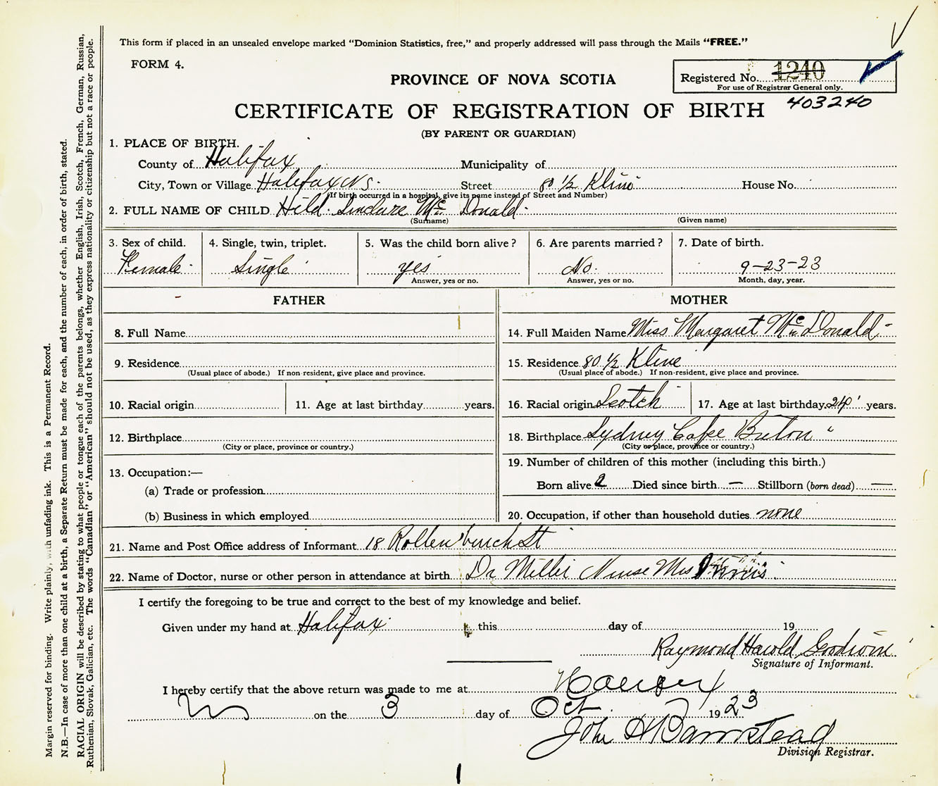 Female Birth Registration: Year: 1923 number: 40300240
