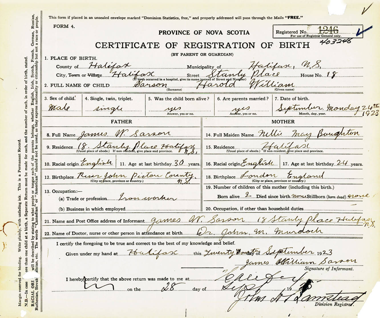 Male Birth Registration: Year: 1923 number: 40300246