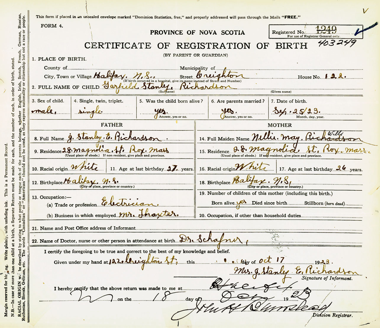 Male Birth Registration: Year: 1923 number: 40300249
