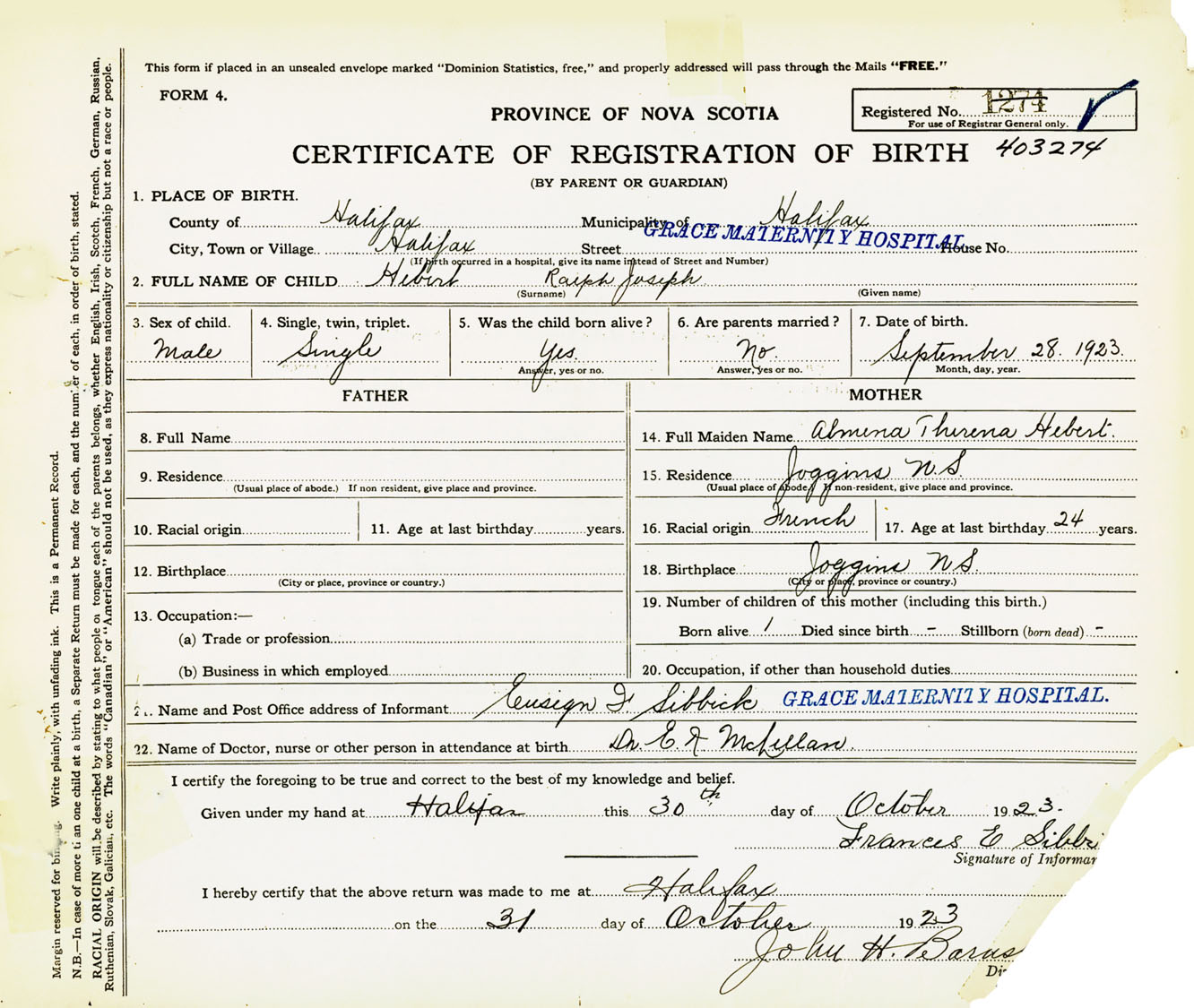 Male Birth Registration: Year: 1923 number: 40300274