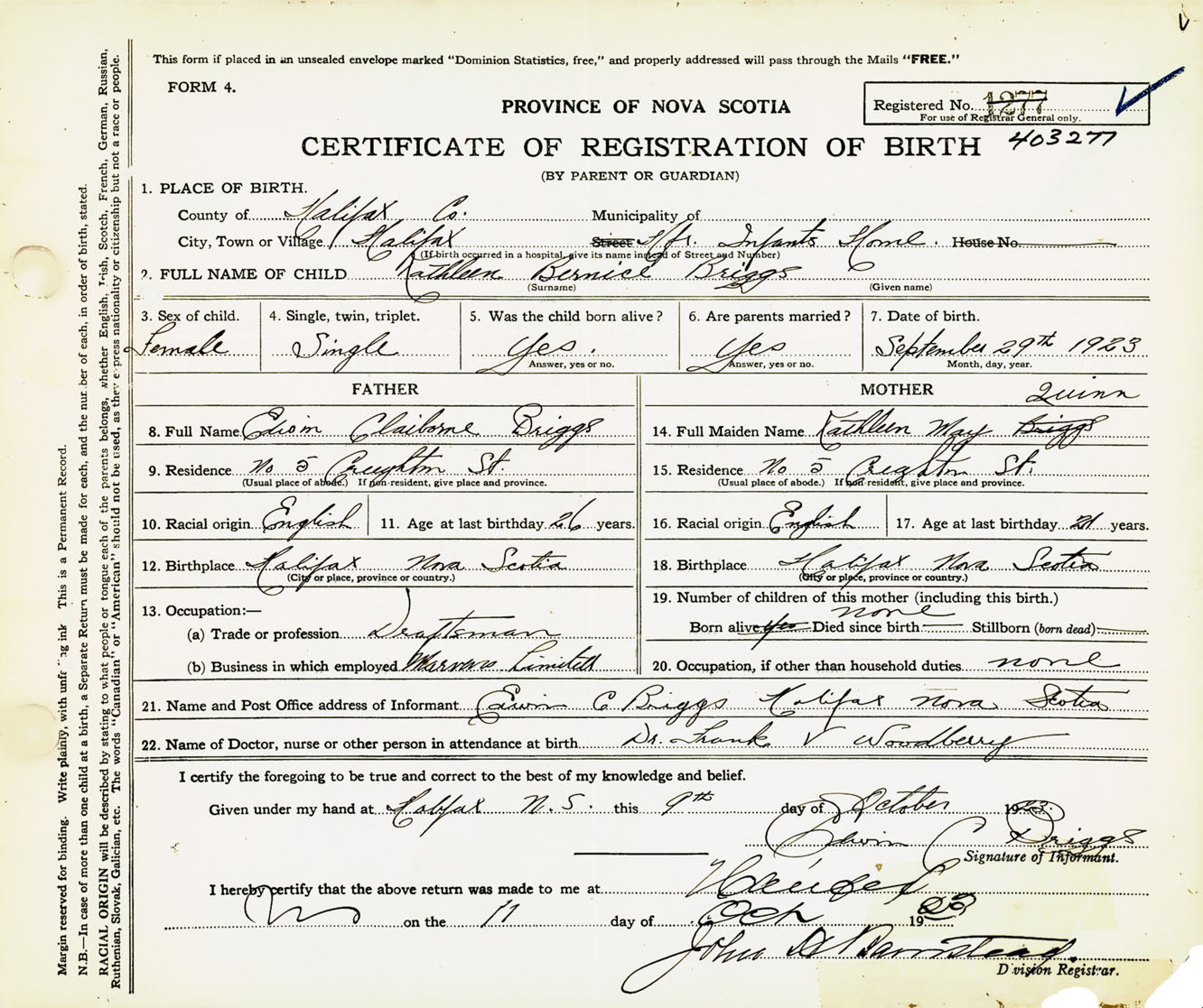 Female Birth Registration: Year: 1923 number: 40300277