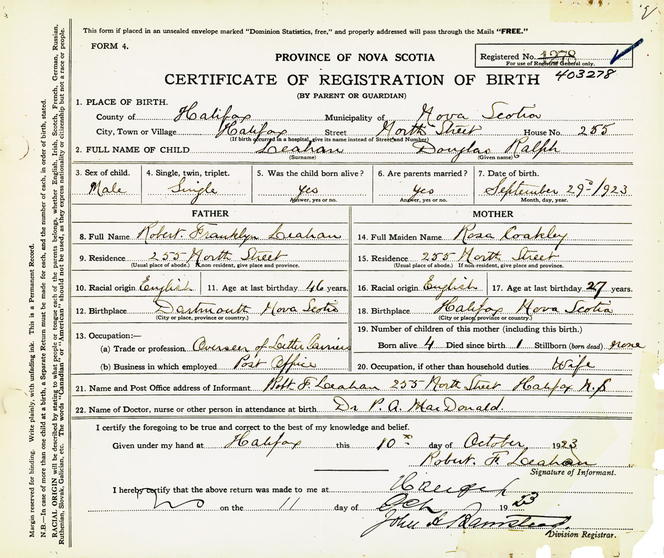 Male Birth Registration: Year: 1923 number: 40300278