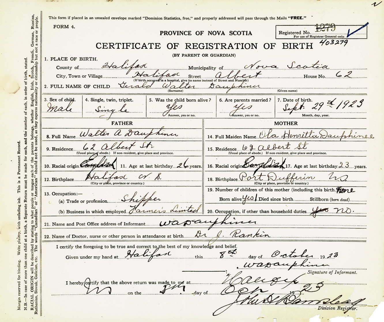 Male Birth Registration: Year: 1923 number: 40300279