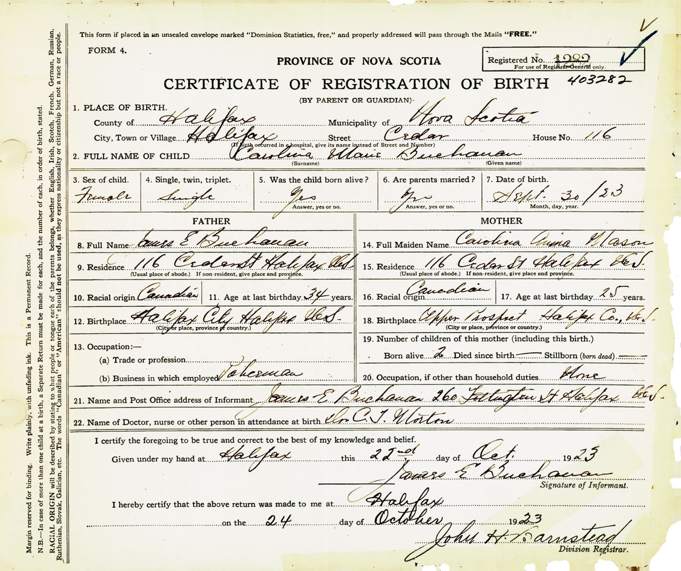 Female Birth Registration: Year: 1923 number: 40300282