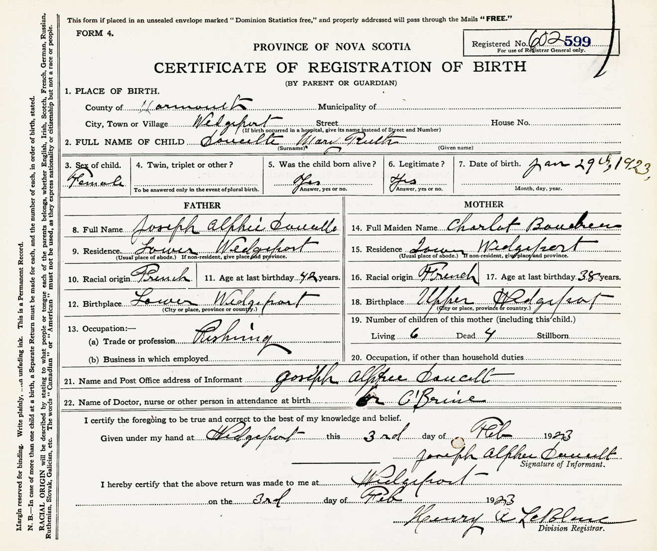 Female Birth Registration: Year: 1923 number: 60200599