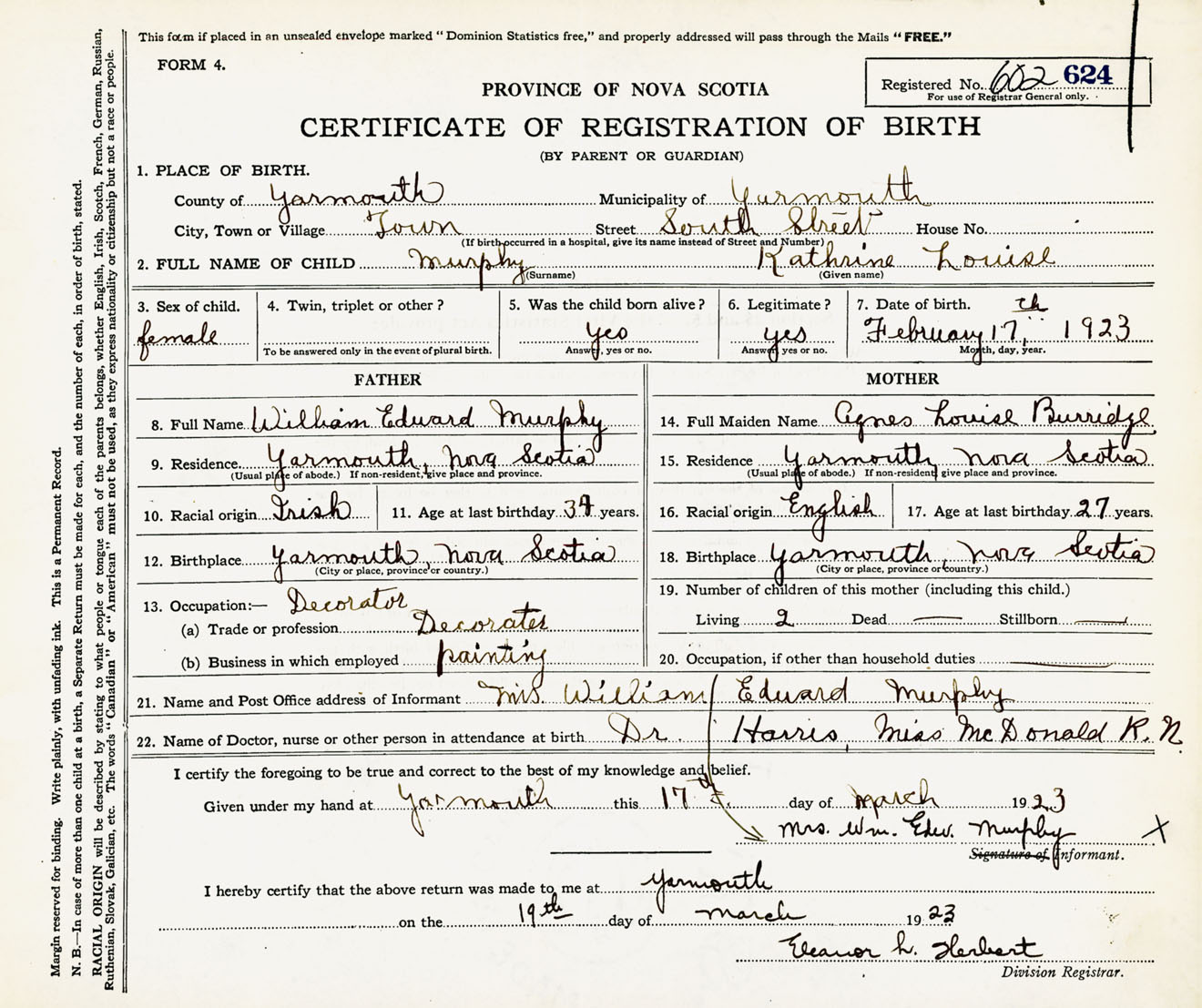 Female Birth Registration: Year: 1923 number: 60200624