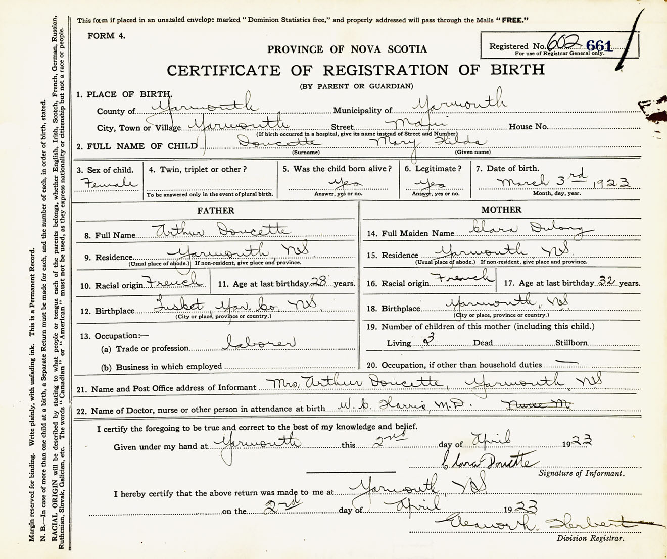 Female Birth Registration: Year: 1923 number: 60200661