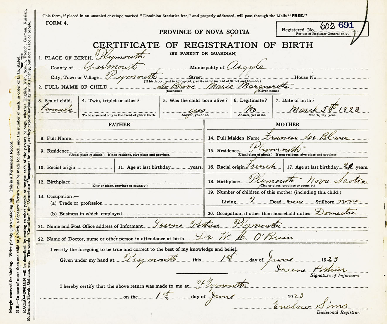 Female Birth Registration: Year: 1923 number: 60200691