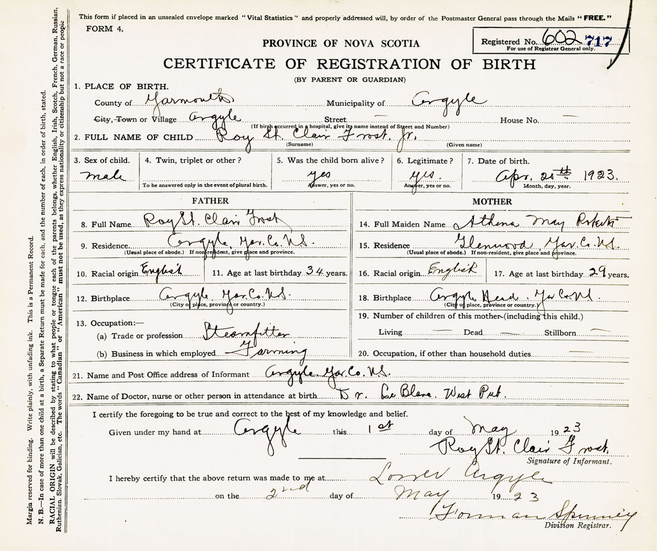 Male Birth Registration: Year: 1923 number: 60200717