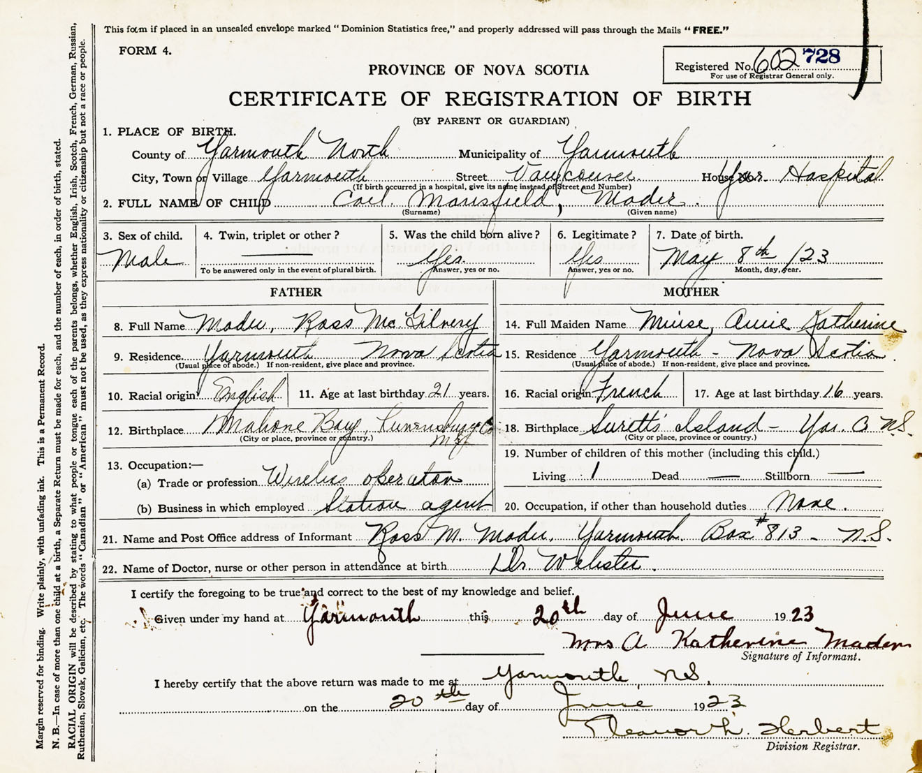 Male Birth Registration: Year: 1923 number: 60200728