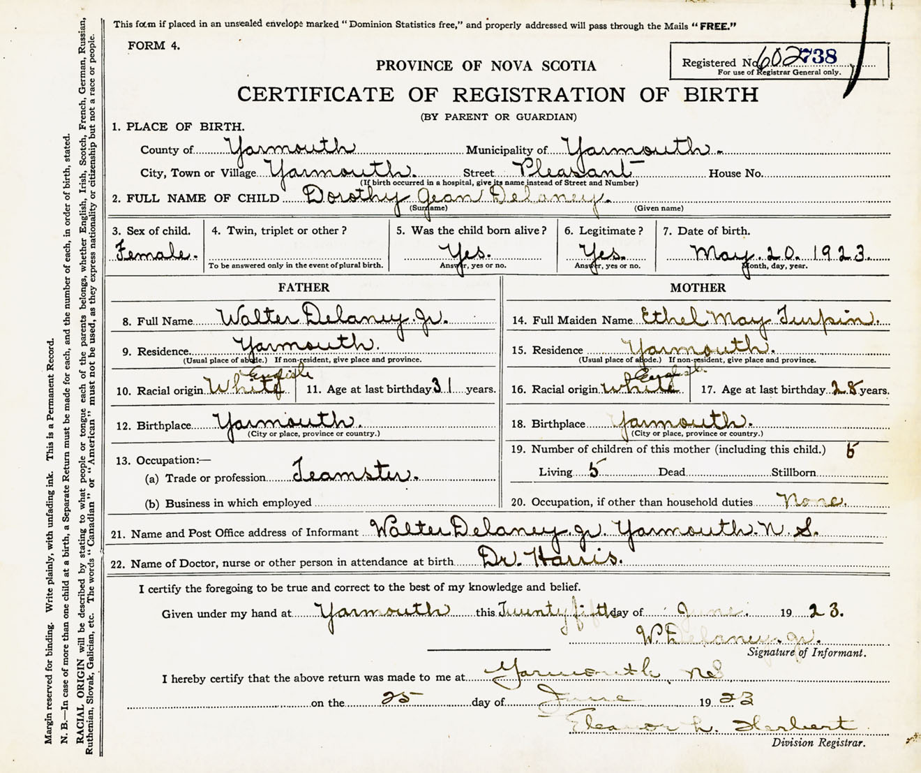Female Birth Registration: Year: 1923 number: 60200738