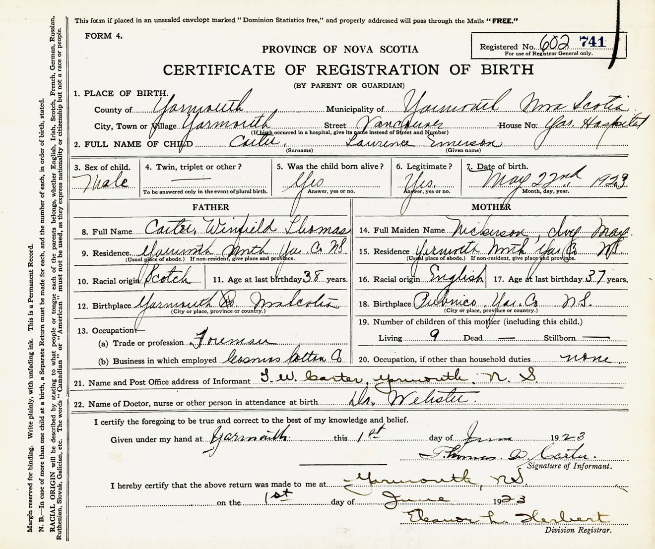 Male Birth Registration: Year: 1923 number: 60200741