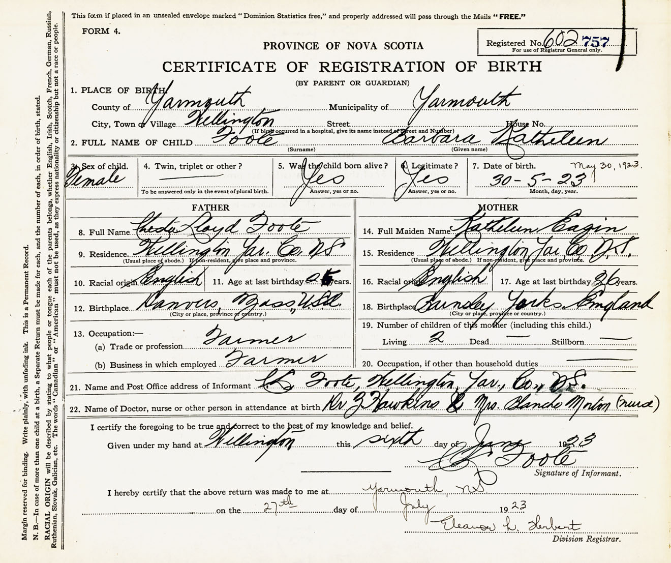 Female Birth Registration: Year: 1923 number: 60200757