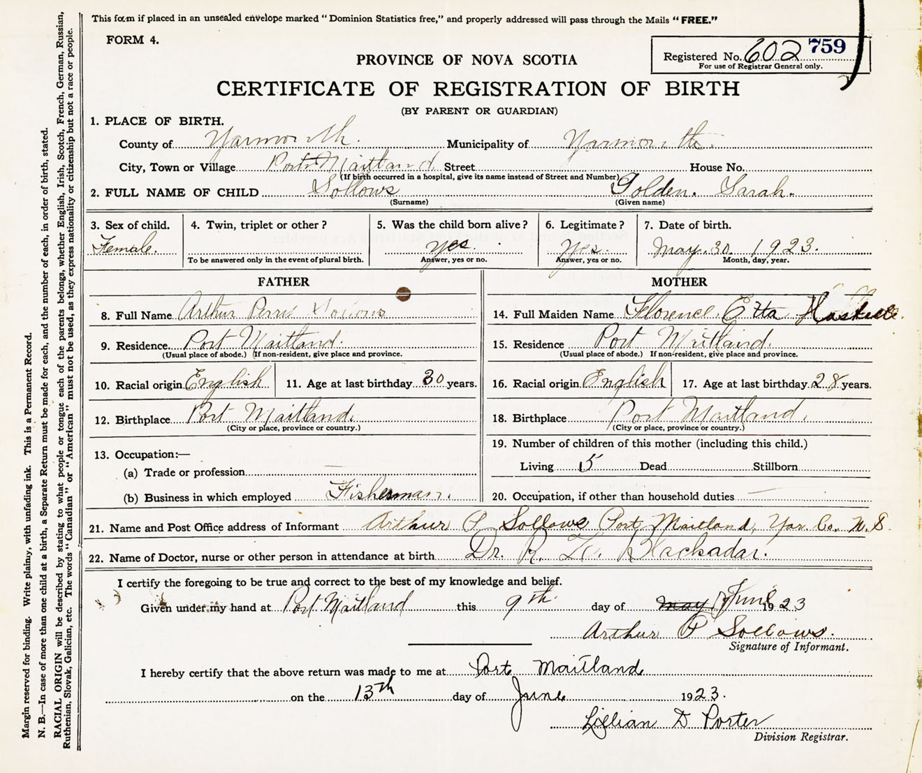 Female Birth Registration: Year: 1923 number: 60200759