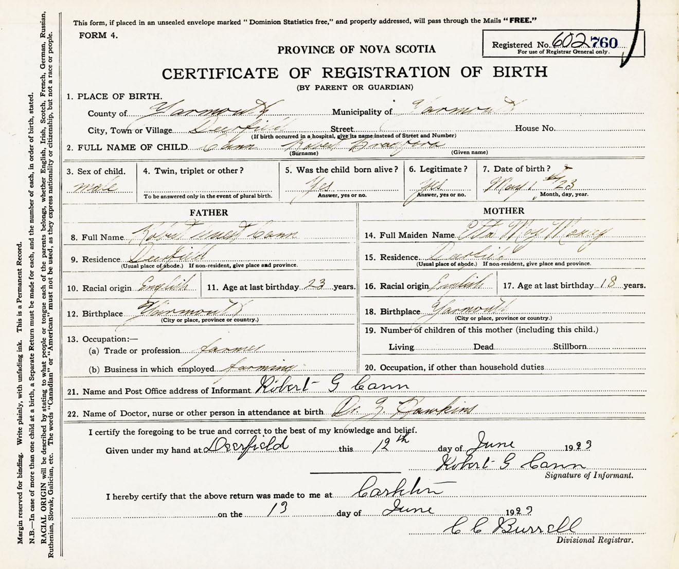 Male Birth Registration: Year: 1923 number: 60200760
