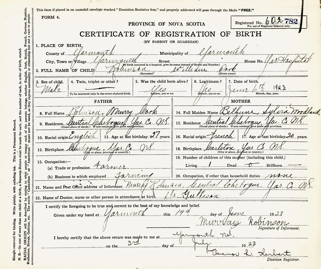 Male Birth Registration: Year: 1923 number: 60200782