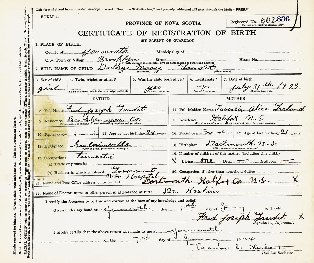 Female Birth Registration: Year: 1923 number: 60200836