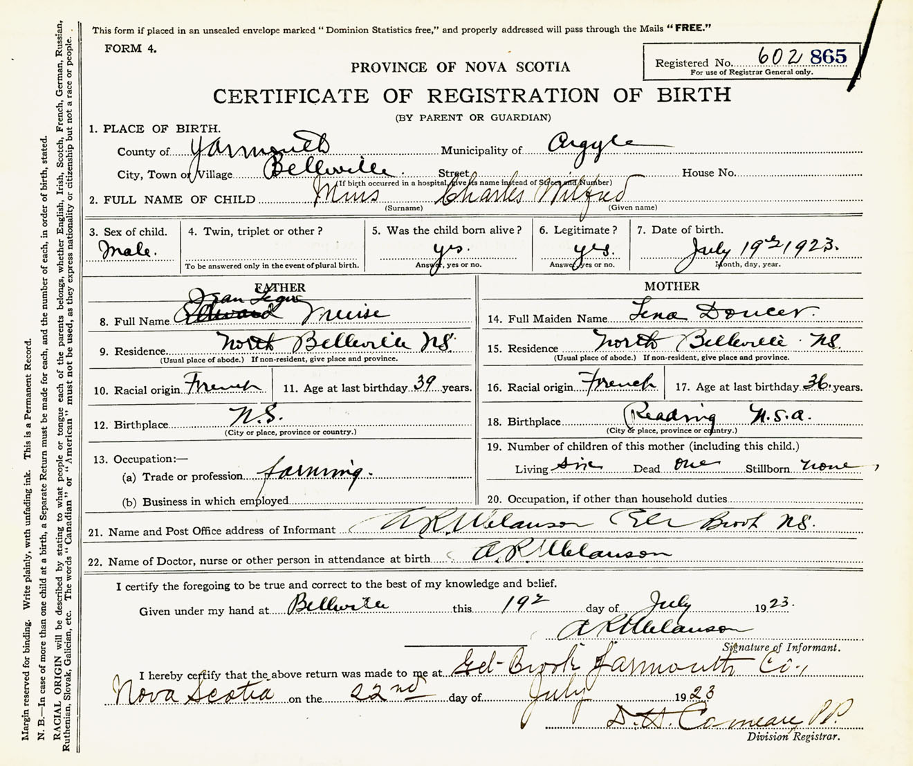 Male Birth Registration: Year: 1923 number: 60200865