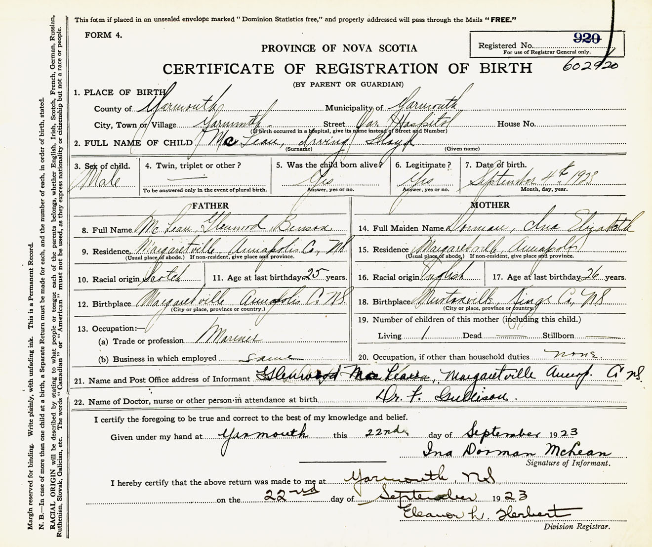 Male Birth Registration: Year: 1923 number: 60200920