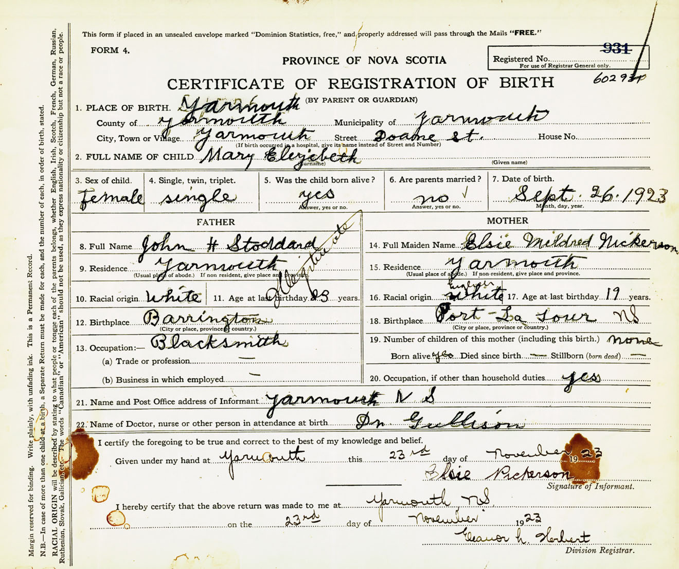 Female Birth Registration: Year: 1923 number: 60200931