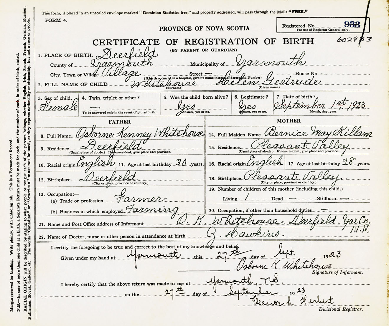 Female Birth Registration: Year: 1923 number: 60200933