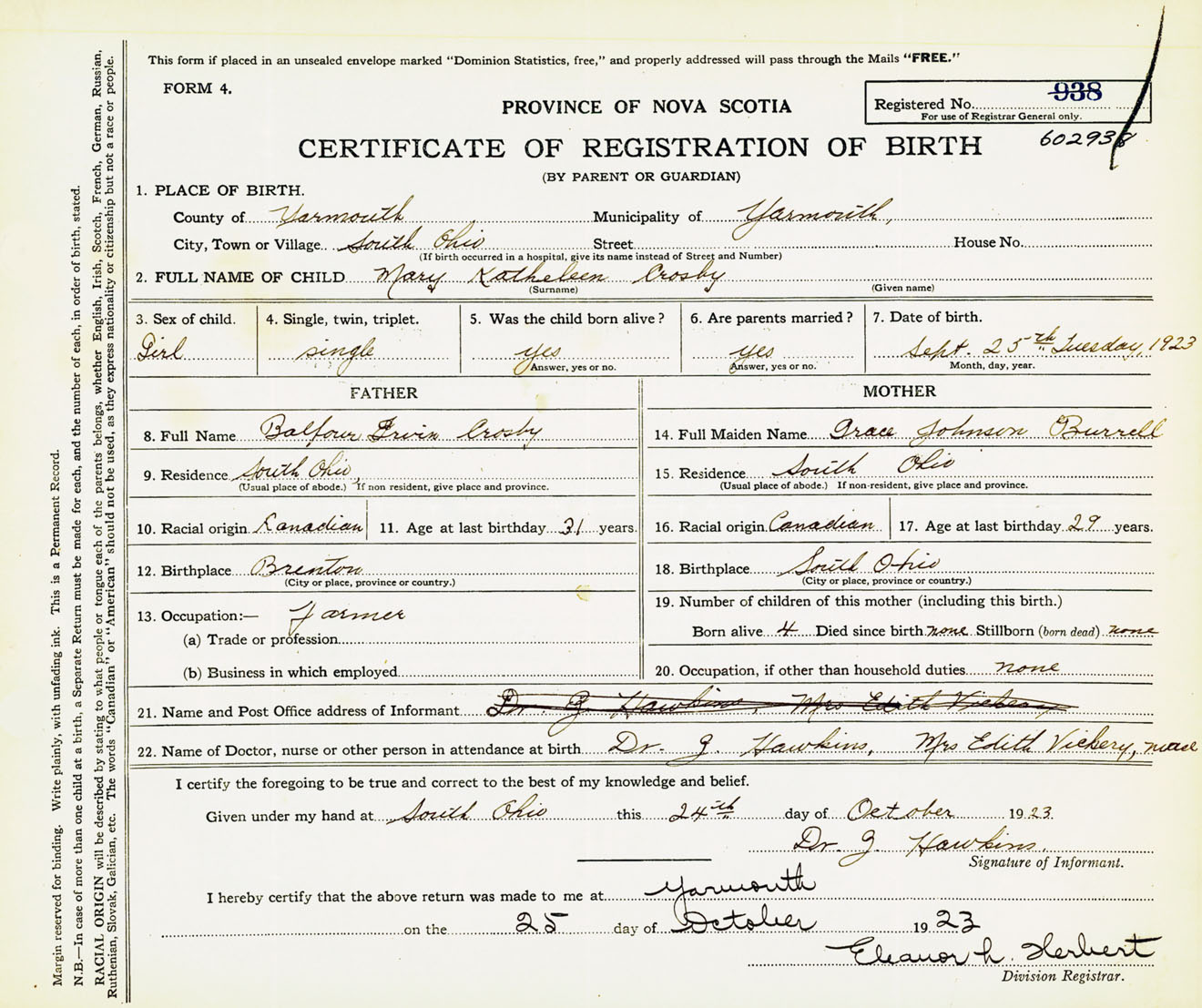 Female Birth Registration: Year: 1923 number: 60200938