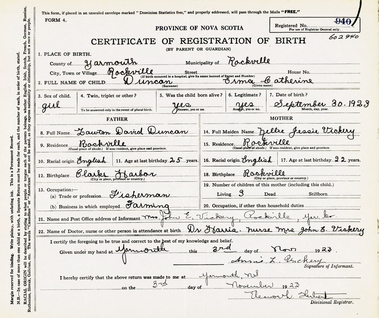 Female Birth Registration: Year: 1923 number: 60200940