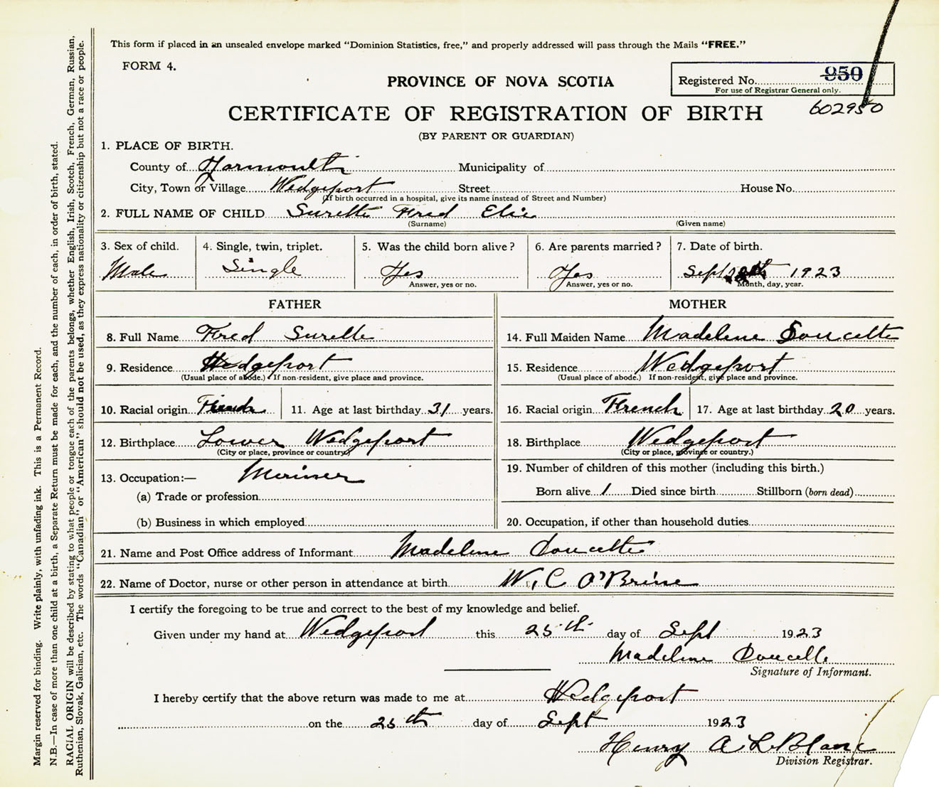 Male Birth Registration: Year: 1923 number: 60200950