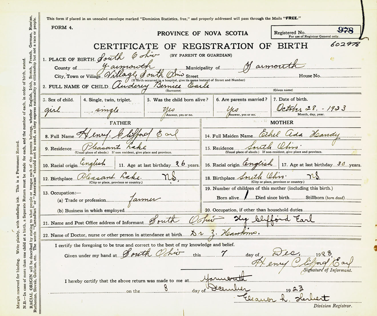 Female Birth Registration: Year: 1923 number: 60200978
