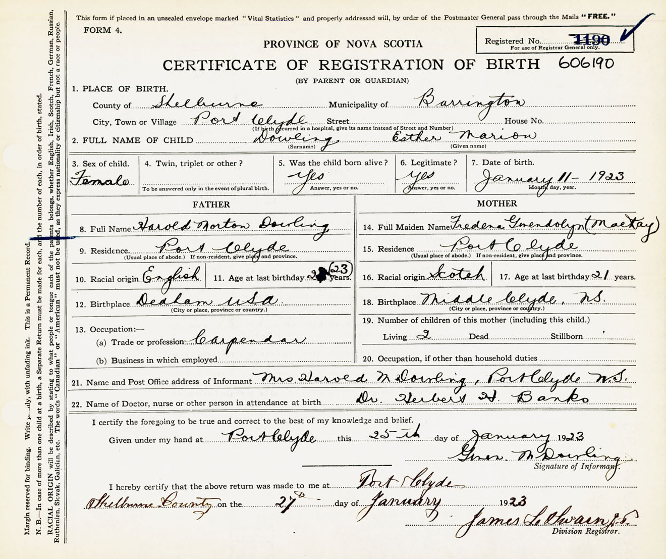 Female Birth Registration: Year: 1923 number: 60600190
