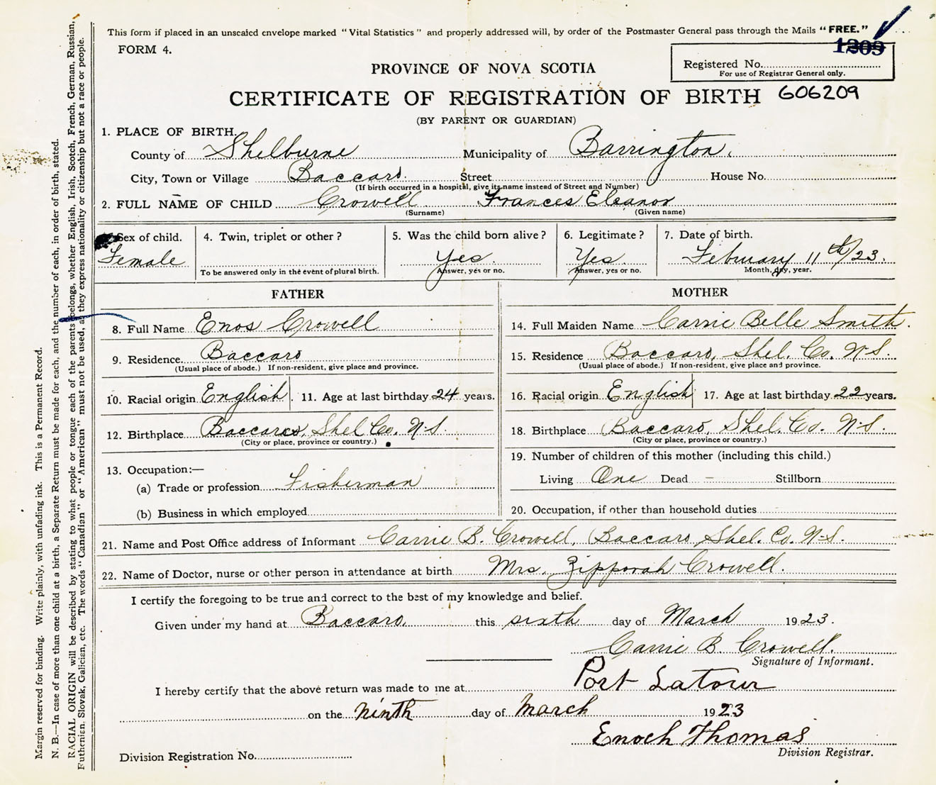 Female Birth Registration: Year: 1923 number: 60600209