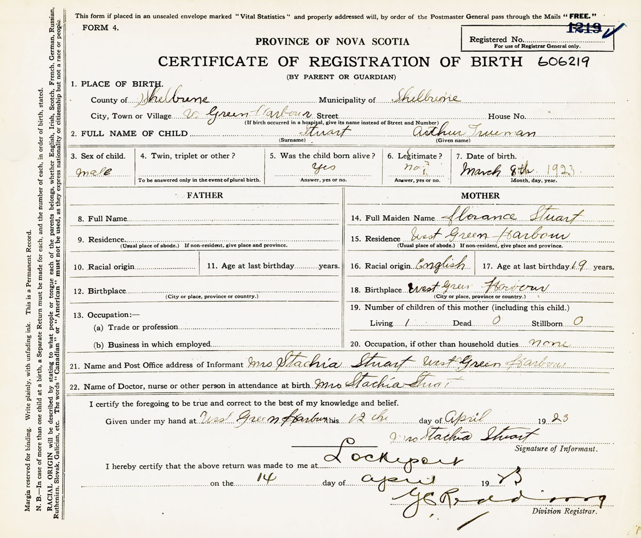 Male Birth Registration: Year: 1923 number: 60600219