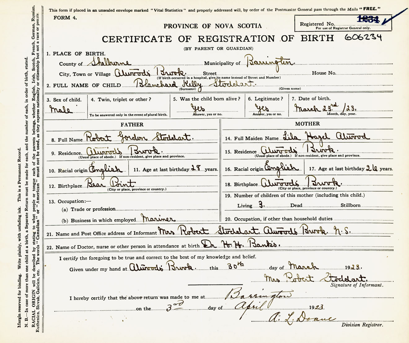 Male Birth Registration: Year: 1923 number: 60600234