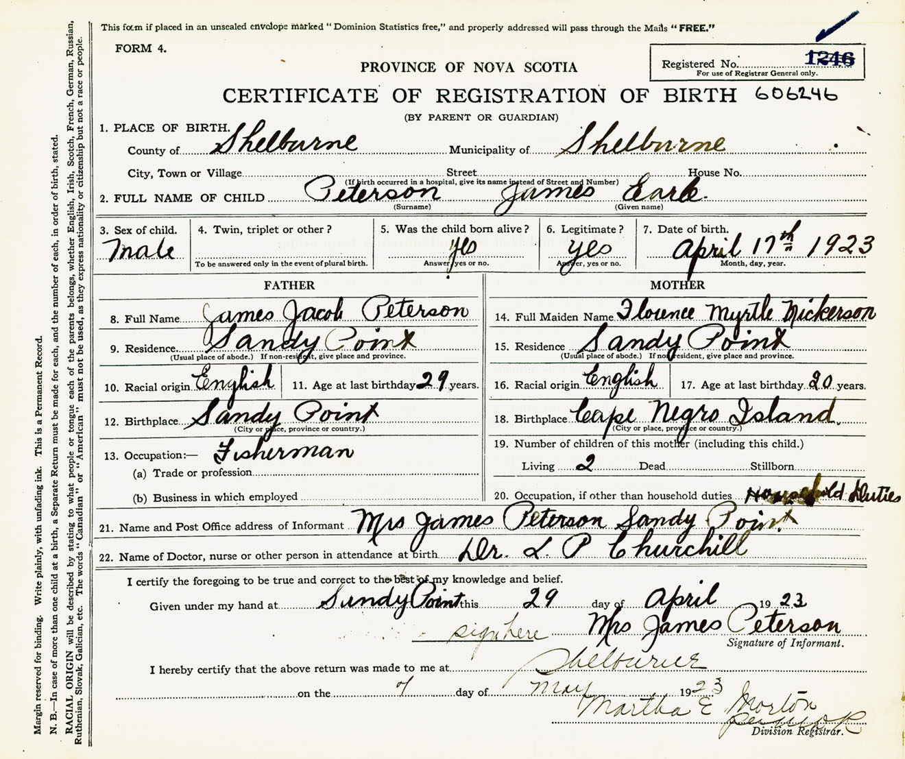 Male Birth Registration: Year: 1923 number: 60600246