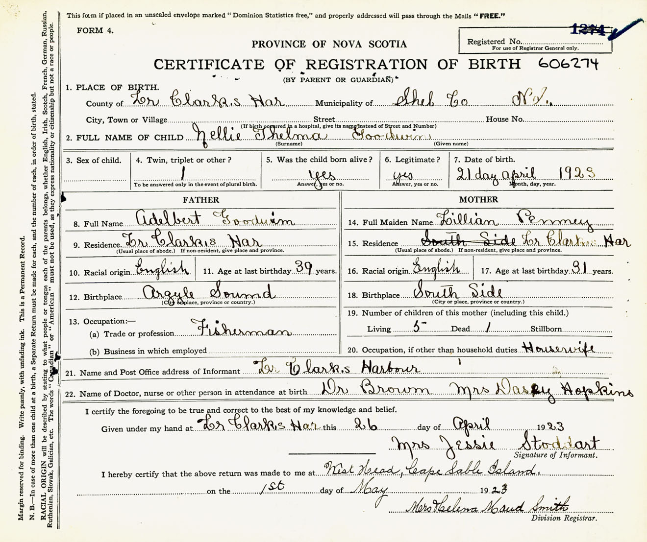 Female Birth Registration: Year: 1923 number: 60600274