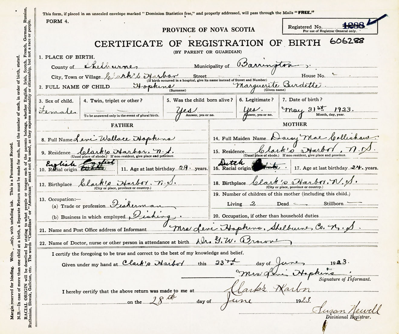Female Birth Registration: Year: 1923 number: 60600288