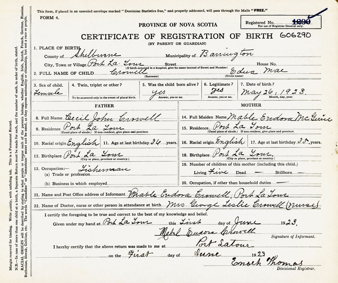 Female Birth Registration: Year: 1923 number: 60600290