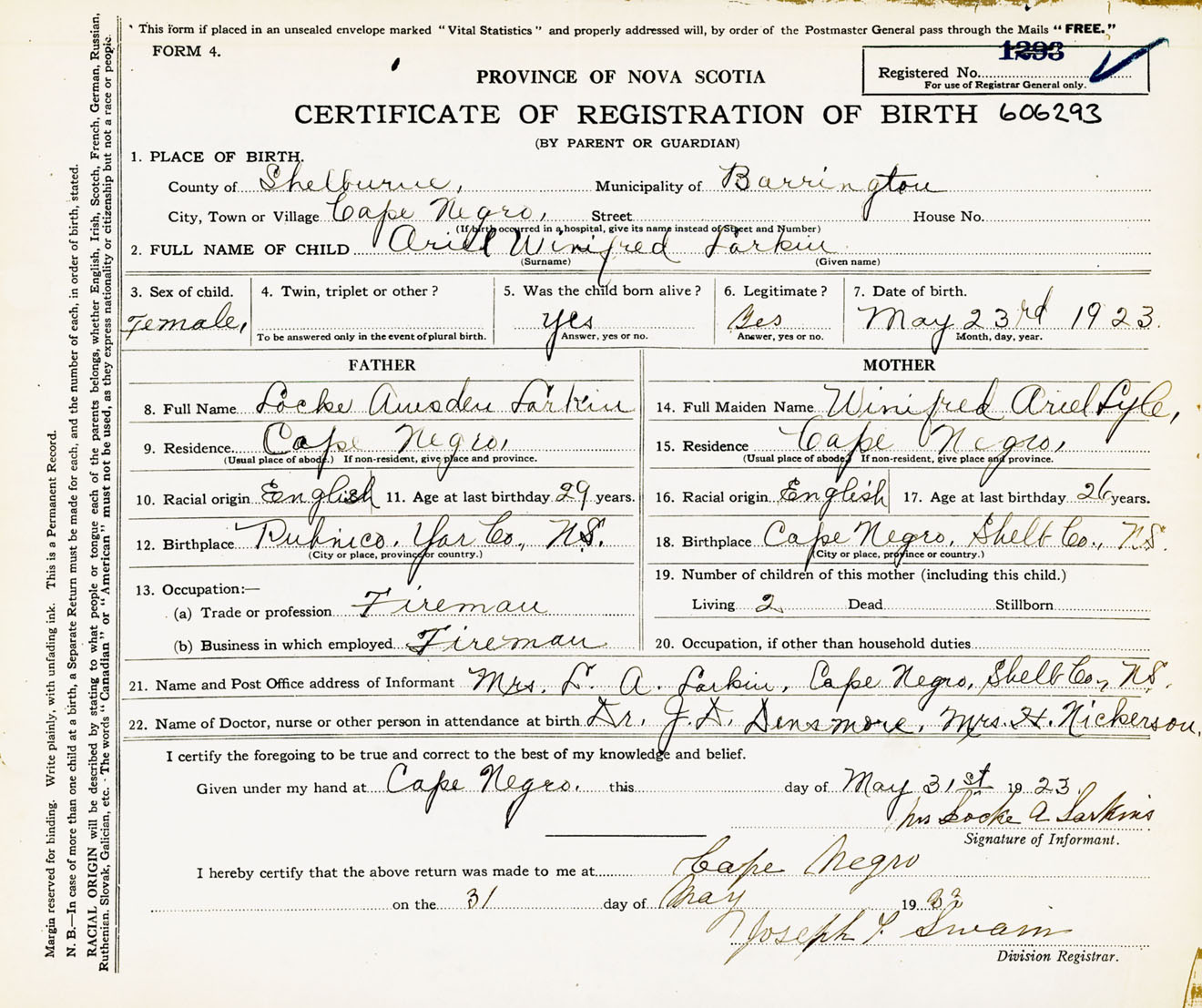 Female Birth Registration: Year: 1923 number: 60600293