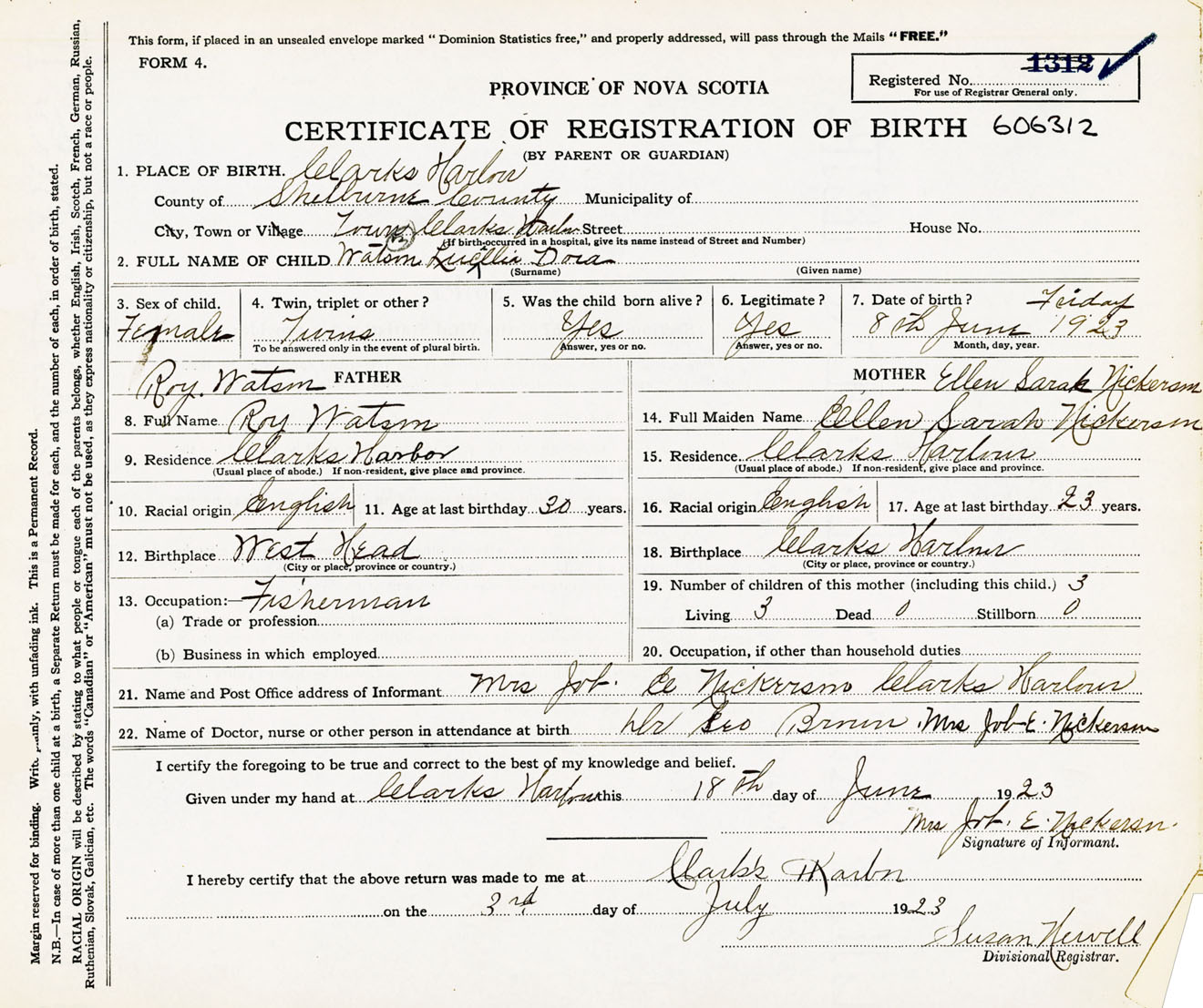 Female Birth Registration: Year: 1923 number: 60600312