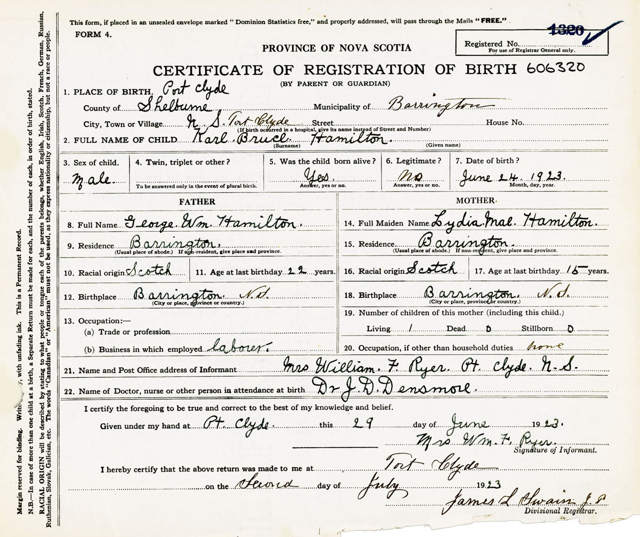 Male Birth Registration: Year: 1923 number: 60600320